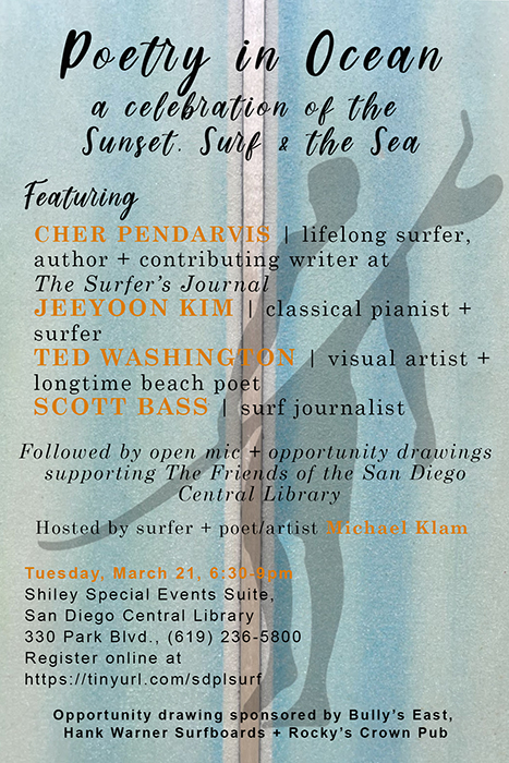 All attendees will have an opportunity to take home a prize from the Friends of the Library, including a custom designed “Poetry in Ocean” surfboard by internationally acclaimed board shaper Hank Warner. Opportunity drawing will also include prizes from our generous and arts-loving sponsors listed below.