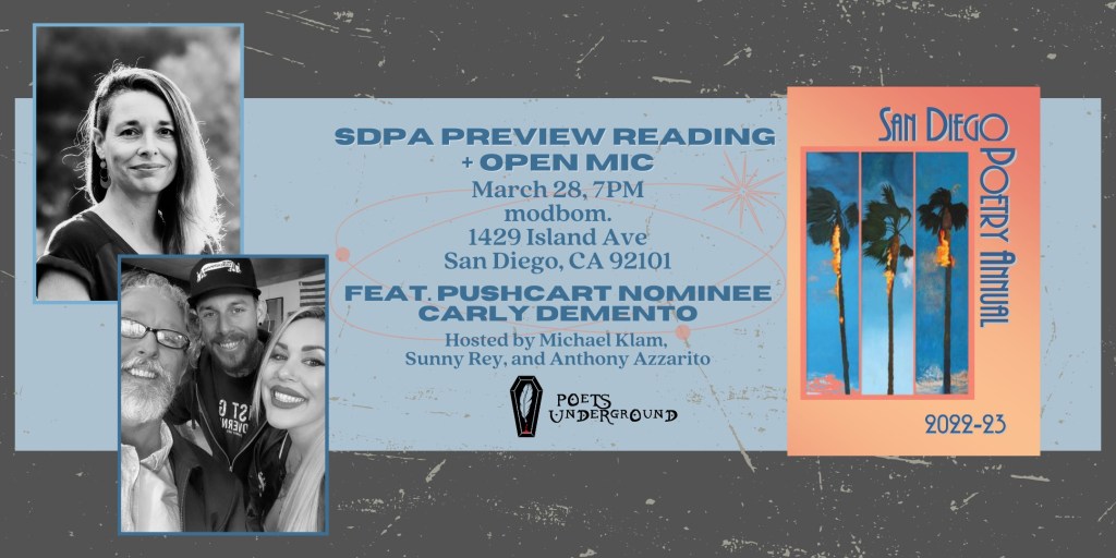 May 2, 5-8pm, SDPA authors + Poets Underground combo event at Template in Ocean Beach, open reading with hosts Sunny Rey, Anthony Azzarito, and Michael Klam. Sign up or get involved by email: sdpoetryannual@gmail.com, SDPA Instagram: @sdpoetryannual and Poets Underground Instagram: @poets_underground_