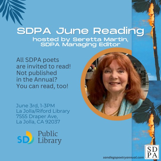 July 21, 2:00 – 5pm, La Jolla / Riford Library Community Room, 7555 Draper Ave. La Jolla, CA 92037. San Diego Poetry Annual open reading. Host: Seretta Martin, SDPA Managing Editor. Open to the Public — Published readers followed by Open Mic. Sign up or get involved by email: sdpoetryannual@gmail.com) Instagram: @sdpoetryannual