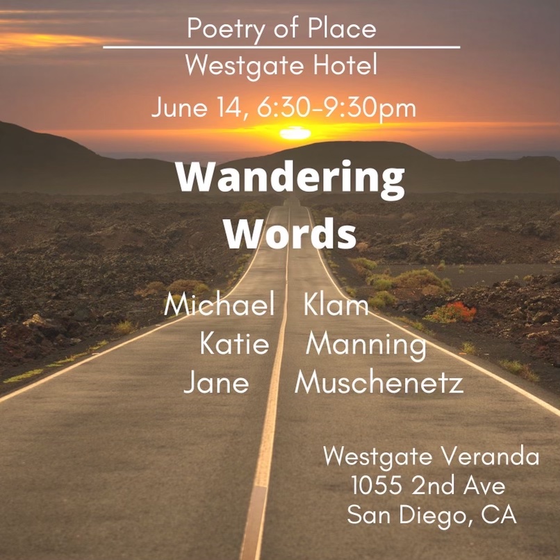 June 12, 7pm, Wandering Words at Nook and Pantry, 3043 University Ave., San Diego, CA 92104. SDPA’s executive editor Michael Klam joins San Diego Poet Laureate Jason Magabo Perez and USD professor/poet Leonora Simonovis for Wandering Words – San Diego’s only reading series devoted to place-based writing. Hosted by journalist/travel writer Michele Bigley.