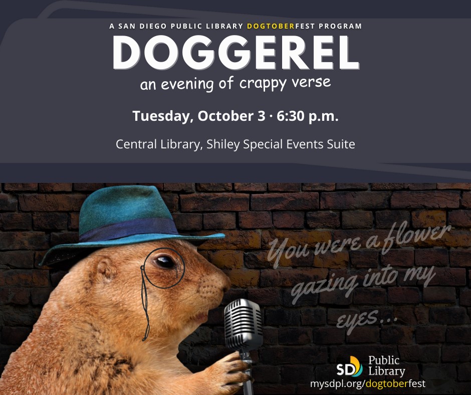 October 3, 6:30-8PM, San Diego Central Library, *Poetry to the People Event*: Doggerel Workshop + Share in the Shiley Event Suite. Register HERE. (Close the pop-up window that comes up when you click the link). Poetry doesn’t have to be serious! A “Doggerel” (comic verse in an irregular pattern) is a great excuse for literary silliness. Come for some ridiculous fun, pranks, prizes, chuckles and guffaws. Family friendly, open to all, FREE.