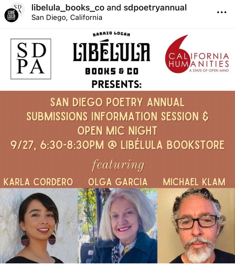 September 27, 6:30-8:30PM: Open Mic at Libélula Books Want to submit to the San Diego Poetry Annual but still have some questions? Join us for a quick information session in Barrio Logan with Regional Editor Karla Cordero, Bilingual Editor Olga Garcia, and Executive Editor Michael Klam. FREE and open to the public!