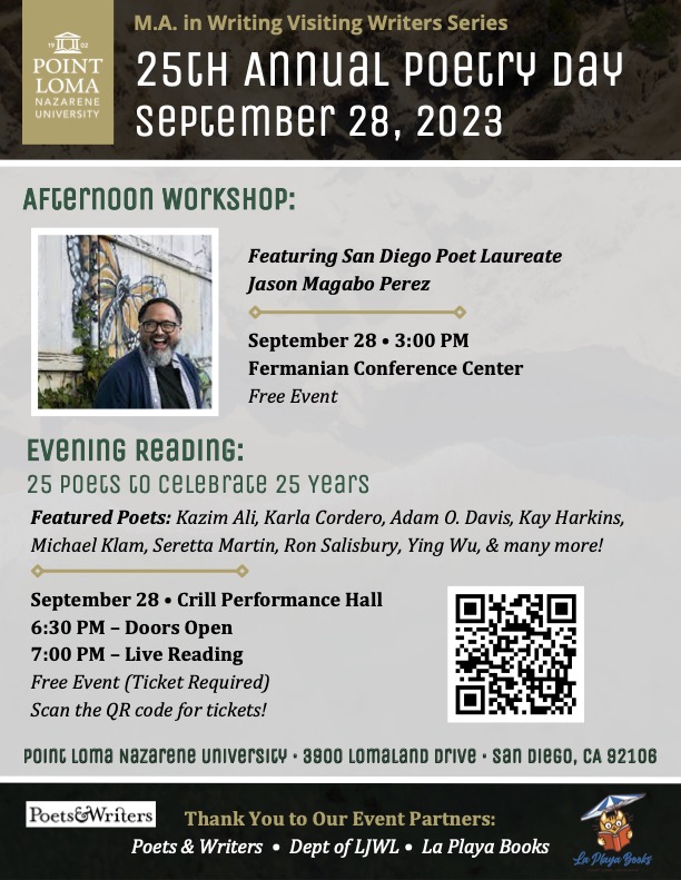 Event made possible by Department of LJWL, PLNU Poetry Day, PLNU MA in Writing, and Writer’s Symposium by the Sea.