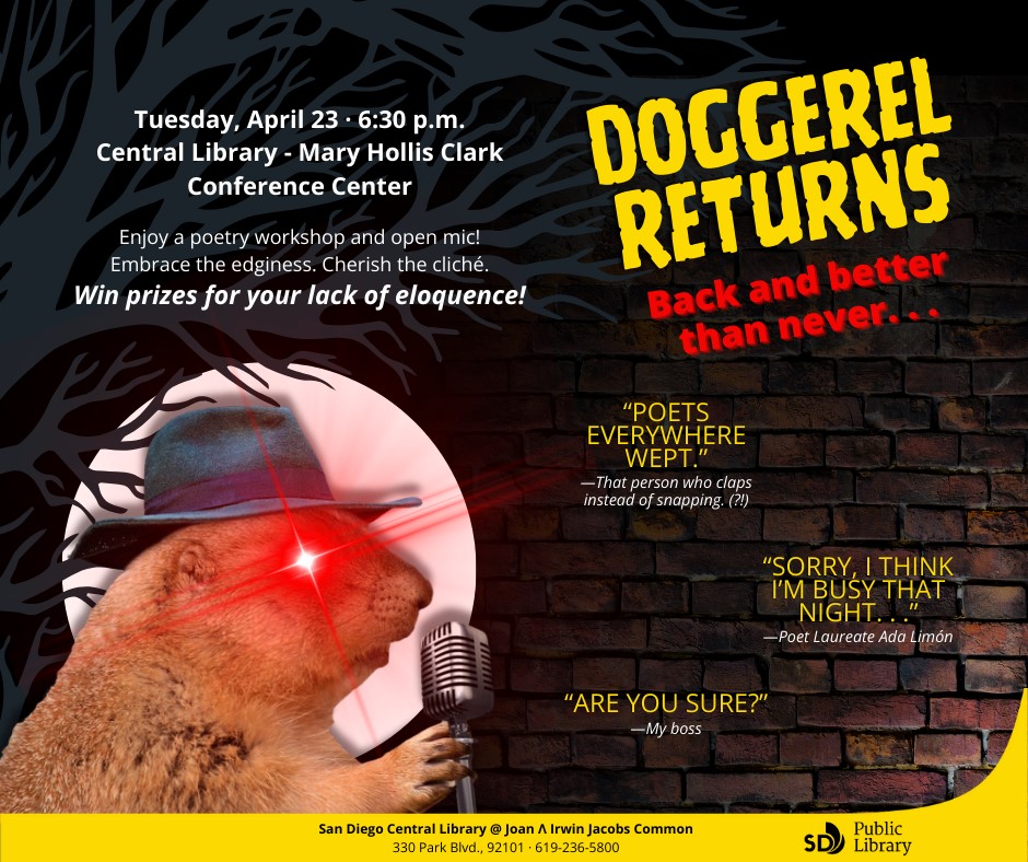 April 23rd, 6:30-8pm, Doggerel is back and better than never! San Diego Central Library in the Mary Hollis Clark room. Take a break from the hustle of National Poetry Month and enjoy an evening of low-brow, overly-contrived, and badly constructed poetry! Win unforgettable prizes for your lack of eloquence or surprise your audience with something approaching a cohesive thought! Register here. It will change your life.