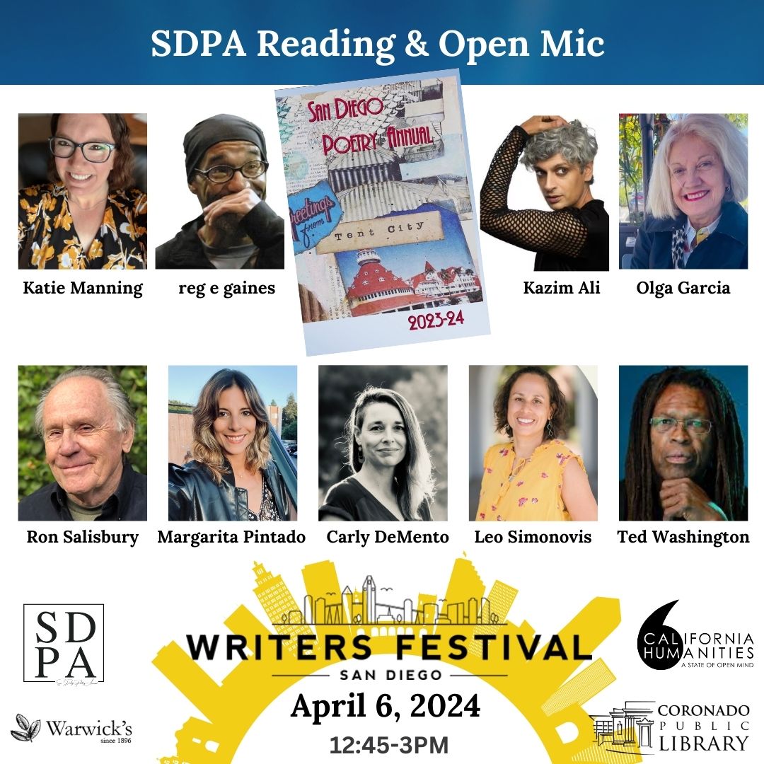 April 6, 12:45-3:15pm, San Diego Writers Festival Reading and Open Mic: Poetry to the People event. Coronado Island, 650 D Avenue, Multipurpose Room, Building 400. Join current and former SDPA authors and editors as we celebrate local poets! Featured SDPA readers will be followed by a community open mic. Bring a poem to share and/or grab a seat to hear work by renowned poets Kazim Ali, Carly DeMento, reg e gaines, Katie Manning, Margarita Pintado, Leonora Simonovis, Ted Washington, SDPA bilingual edition editor Olga García, and inaugural San Diego Poet Laureate Ron Salisbury. Hosted by SDPA execs Michael Klam and Jane Muschenetz, this event highlights SDPA authors and is open to all. To read, email sdpoetryannual@gmail.com To volunteer and join the team, sign up here.