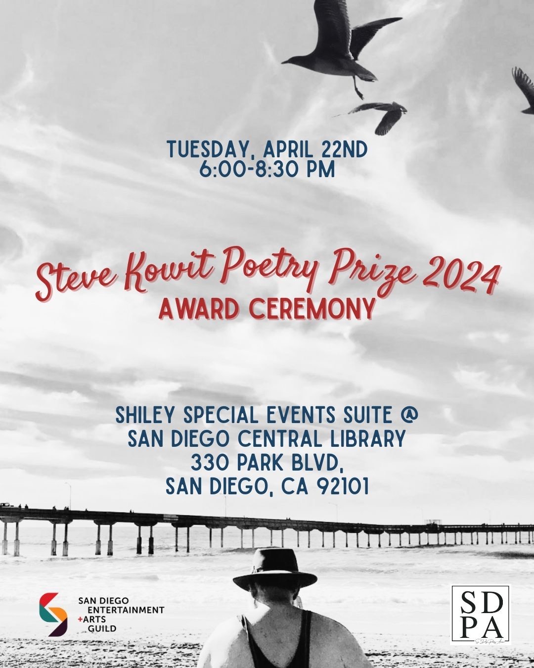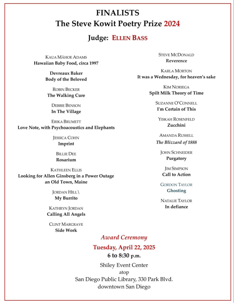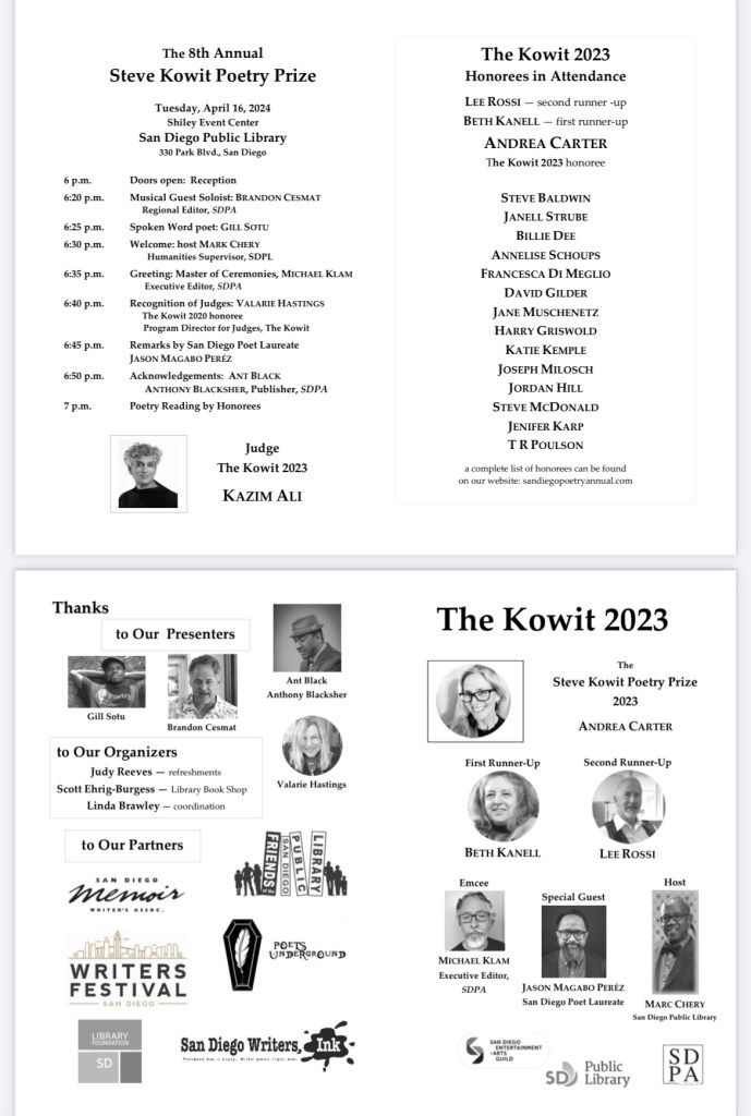 April 21, 2026, 6pm-8:30pm: Steve Kowit Poetry Prize at Central Library hosted by Bill Harding, Valarie Hastings and Michael Klam. Sign up to volunteer and get details at sdpoetryannual@gmail.com or SDPA Instagram: @sdpoetryannual.