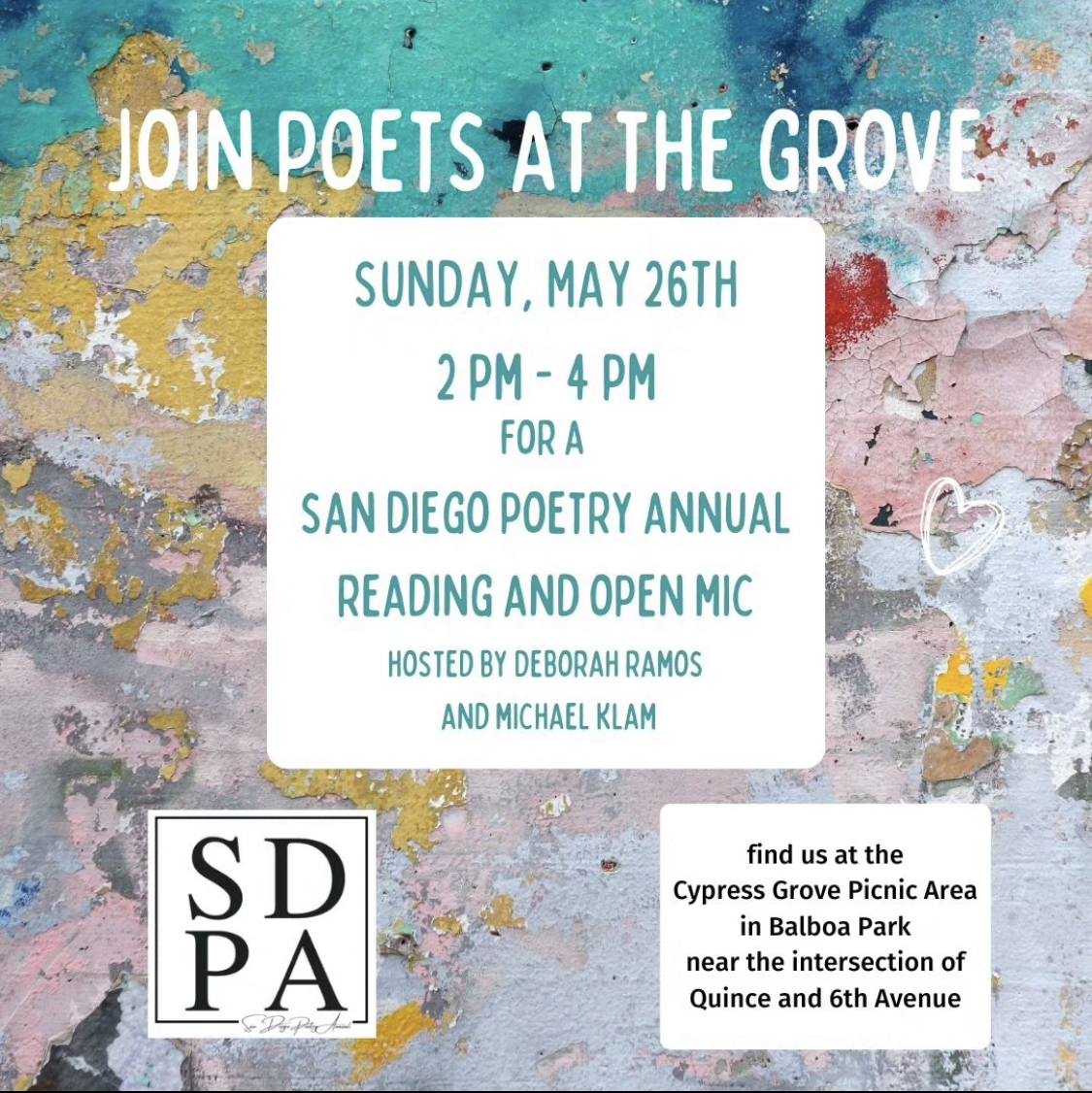 May 26, 2-4pm, last Sunday, Poets at the Grove in Balboa Park (see map below), SDPA and community reading with hosts Deborah Ramos and Michael Klam. (Sign up or get involved by email: sdpoetryannual@gmail.com) Instagram: @sdpoetryannual and @debramospoeticart