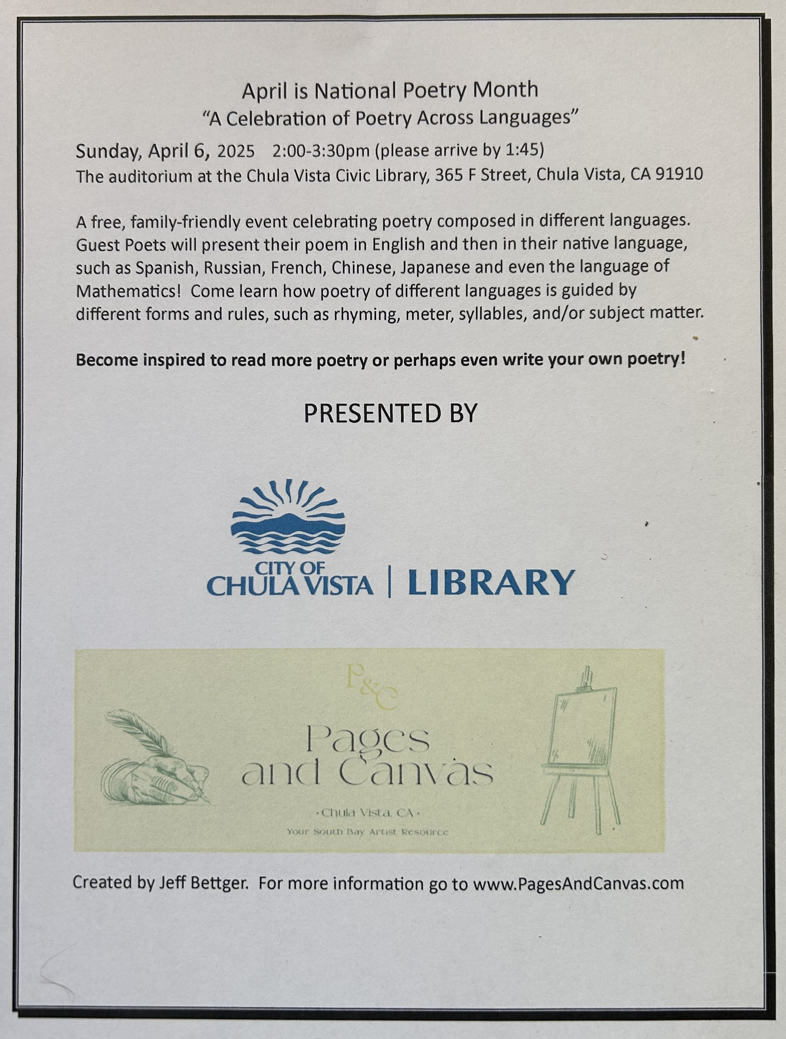 April 6, 2-3:30pm: A Celebration of Poetry Across Languages with host Jeff Bettger at the Chula Vista Civic Library. Visit PagesAndCanvas.com for details and see below: