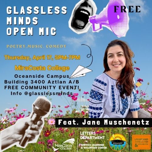 April 17th, 5-7pm: MiraCosta College FREE in Oceanside, Building 3400 Aztlan A/B. Join SDPA Editor and Host Karla Cordero and SDPA Director of Partnerships, Jane Muschenetz, as she features for the Glassless Minds Open Mic and Reading Series. Bring a poem to share!