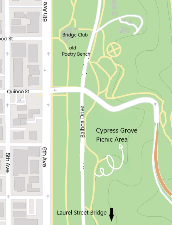 June 29, 2-4:00pm, Poets at the Grove/SDPA combination reading in Balboa Park (See map below). All poets are featured at The Grove. Readings at The Grove are open to all poets and is a safe place to share your work and enjoy a peaceful corner of our beloved Balboa Park. There’s no sign-up sheet, no microphone, no cover charge, no secret password. Connect to the earth mother and the poetry community to enjoy the most organic reading in all the land! We don’t have a wine bar, espresso bar, or personal pizzas, but we offer a lot of heart and soul. All appreciators are welcome. It’s a good idea to bring more than one poem, as we’ll each have at least three or more turns to read. As always, we sit in a circle, and take turns reading one poem each. The Grove is accessible to all. Hosted by Deborah Ramos and Michael Klam.