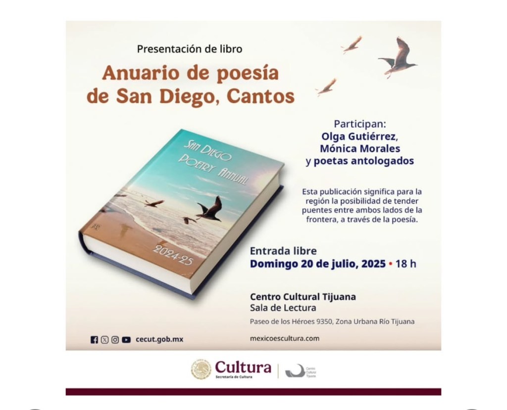 Hola queridos amigos poetas y traductores: Estamos invitados por IMAC, a presentar Cantos Anuario de Poesía de SD 2024-25, para celebrar el 21 de marzo, Día de la Poesía, en la Casa de la Cultura en la colonia Altamira de Tijuana. Ese día haré entrega de su ejemplar gratuito de Cantos. Gracias a Samantha Luna, miembro del IMAC, y a Mara Maciel, directora de la Casa de la Cultura por esta hermosa y significativa invitación. En la presentación tendré el gusto y honor de estar acompañada por la reconocida y admirada poeta Ruth Vargas Leyva. Después de la presentación tendremos micrófono abierto. Inviten por favor a amigos para continuar escuchando poesía. El programa es el siguiente: 15:00 horas Lanzamiento de la convocatoria del XXVII Premio Nacional de Poesía Tijuana. 16:00 horas Presentación de la edición bilingüe 2024-25 del San Diego Poetry Annual. 17:00 horas Micrófono abierto: Jam Session de Poesía Vol. 1. Gracias mil por permitirnos publicar y gozar de sus magníficos poemas. Abrazo fuerte, Olga García